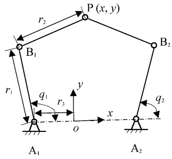 To verify that the proposed method is also suitable for parallel manipulators, a planar 5R parallel manipulator [28] was taken as an example for analysis. The mechanism diagram is shown in Figure 10. and represent the drive pair, and the other end of the drive link is represented by and . The common intersection point of the two branch chains is represented by as the output point. The origin of the coordinate system is at the center of , x is along the direction of , and the y-axis is perpendicular to . and . Under the premise that the output pose is and the drive is , the robot’s input–output relationship is: