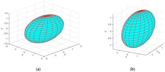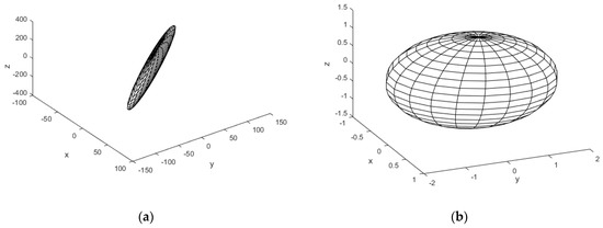 The EE velocity ellipsoid with and . (a) Translational velocity ellipsoid; (b) rotational velocity ellipsoid.