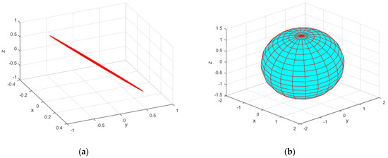 The translational velocity ellipsoid and rotational velocity ellipsoid of the EE corresponding to the singular configurations of the 7-DOF serial manipulator obtained in Section 3.2.2 are shown in Figure 13, Figure 14 and Figure 15. To illustrate the singular configurations, the 7-DOF serial manipulator is returned to a nominal configuration and the corresponding translational velocity and rotational velocity ellipsoids are computed, as shown in the Figure 16. Figure 16 clearly indicates that the EE translational velocity and rotational velocity ellipsoids are both standard ellipsoids. However, Figure 13b, Figure 14b and Figure 15b illustrate that the translational velocity ellipse evolves into an elliptical plate with a thickness of zero, indicating that the manipulability measure of the 7-DOF serial manipulator is zero, i.e., the 7-DOF serial manipulator approaches singular configurations. It is thus verified that the singular configurations of the 7-DOF serial manipulator obtained by the proposed method are correct.