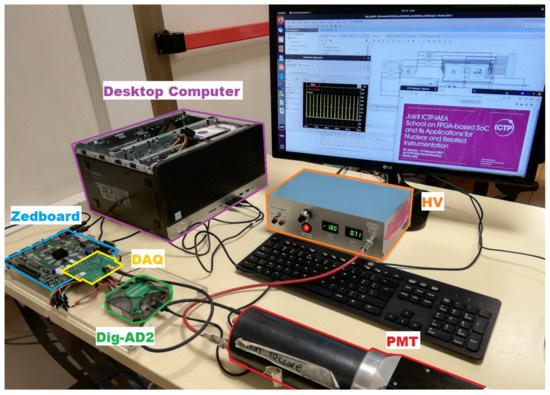 - The ICTP hardware setup was based on a digital pulse processing system for X-Ray and nuclear spectroscopy, which was developed at MLab-ICTP. The system featured: a ZedBoard carrier card, an in-house high-speed data acquisition (DAQ) mezzanine card, a photo-multiplier tube (PMT) [30] with a scintillator crystal, a high voltage (HV) power supply, and a Dig-AD2 multi-function instrument. This setup is depicted in Figure 3.