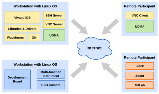 - Mohsen, A.E.; Youssef GadAlrab, M.; elhaya Mahmoud, Z.; Alshaer, G.; Asy, M.; Mostafa, H. Remote FPGA Lab For ZYNQ and Virtex-7 Kits. In Proceedings of the 2019 IEEE 62nd International Midwest Symposium on Circuits and Systems (MWSCAS), Dallas, TX, USA, 4–7 August 2019; pp. 185–188. [Google Scholar] [CrossRef]