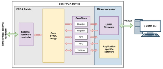 - The Communication Block (ComBlock) [41], which is an easy-to-use link layer between the microprocessor and the FPGA.