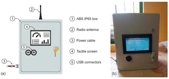 The gateway (Figure 4) consists of a small single-board computer (Raspberry Pi 4) connected via serial to an ATMEL ATSAMD21G18 microcontroller with a LoRa RFM95 radio module and a 4G modem (E3372H-320, Huawei, Shenzhen, China). The modem was selected considering the compatibilities with the single board computer and its operating system. The Huawei E3372H-320 behaved as a plug-and-play high-speed 4G dongle (when 4G LTE not available: 2G/3G) and for the Raspberry Pi 4 and Raspberry Pi operating system (Raspbian GNU/Linux 10), no further provisioning or setup is required. In addition, the system has a 7-inch capacitive tactile screen (164.9 × 124.27 mm) that serves as a direct user interface for system managing and data visualization. This screen is connected via an HDMI connection and a USB for tactile feature recognition. The full system is powered by a USB-C type power supply (input: 100–240 V AC 50/60 Hz 0.5 A max; output: 5 V DC 3.0A). Even if the system is thought to be indoors at the office, all components are protected in a certified watertight (IP65) acrylonitrile butadiene styrene (ABS) plastic enclosure (400 × 300 × 220 mm).