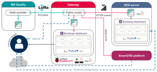 To visualize, download and manage the collected data, as well as, for the remote configuration of the network, an online management platform was developed (https://gea-ecohidraulica.org/downloads/ScreenshotsDashboard.pdf, accessed on 20 July 2021). To avoid the need for mobile apps, the design was based on Bootstrap [21] in combination with PHP and JavaScript functionalities. Bootstrap is a free and open-source front-end framework used to create responsive (device agnostic) websites and web apps. The platform with full functionalities is online while a simplified version of it behaves as a local dashboard in the gateway. The online platform is hosted by a provider without traffic limitations. Due to the nature of the project, access to the online dashboard is limited, therefore a massive traffic on it is not expected. Considering this, we tested up to 20 users working simultaneously without noticeable performance reduction. The local dashboard of the gateway is only accessible in situ or by admin remote access.