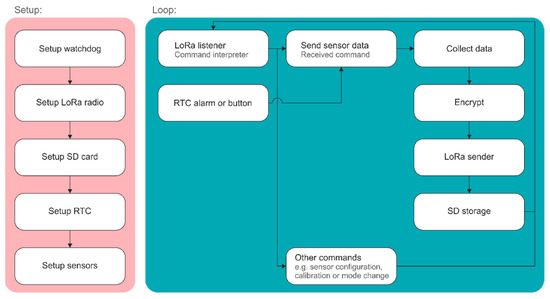 The ATSAMD21G18 microcontrollers (in the node and in the LoRa module of the gateway) are programmed in C using the Arduino integrated development environment (Arduino IDE) [19]. The single board computer (Raspberry Pi) is running the Raspberry Pi operating system (Raspbian GNU/Linux 10) (Figure 5). The developed code for the microcontroller allows bidirectional encrypted communication between nodes and the gateway. The node has its own address, which allows the gateway to identify and synchronize its transmission cycles (i.e., when there are more nodes, the gateway asks for data to each available individual address).