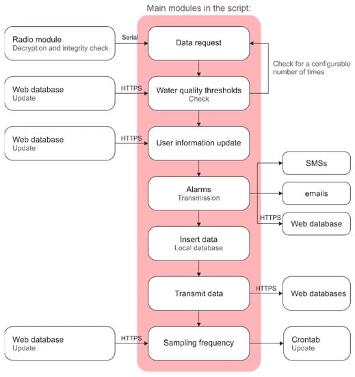 The execution of the main script is automatically repeated using the UNIX Crontab utility. Likewise, the repetition frequency is recursively updated when managers change the data sampling rate in the online management platform. Although Cron can schedule multiple jobs (or scripts) at the same time, simultaneously for all practical purposes, if jobs use the same resources (for instance serial communication with the same radio) can generate conflicts in the system or unexpected delays. Therefore, to ensure no conflict between communication scripts, the designed architecture consists of a main modular and sequential script that controls the whole flow of the data collection and transmission (Figure 7).