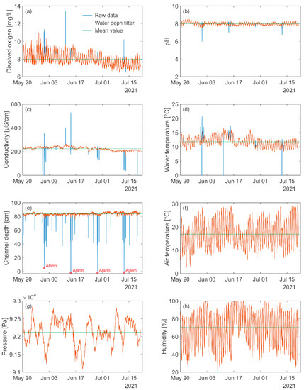 Data collected by MS Quality and exported to the web server by the network. In blue raw data and in red after minimum depth filtering to ensure the sumergence of water quality sensors (depth > 75 cm): (a) Disolved oxigen (mean = 7.96 mg/L); (b) pH (mean = 7.98); (c) Conductivity (mean = 223.64 μS/cm); (d) Water temperature (mean = 11.76 °C); (e) Channel depth (mean = 84 cm); (f) Air Temperature (mean = 16.90 °C); (g) Barometric pressure (mean = 92,118 Pa); (h) Humidity (mean = 70.53%).