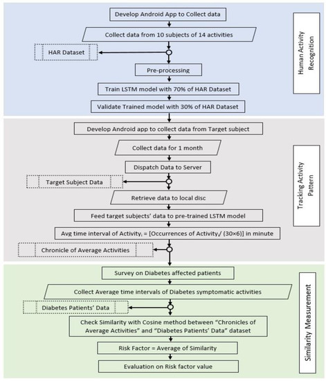 With knowledge of earlier studies on the associations between human activities and NIDDM, we had our elementary foundation to forge ahead to accomplish a real-time diagnosing system to forewarn people before the deteriorated effects of Diabetes occurred. We also emphasized creating possible improvements in HAR performance to corroborate a robust system. Furthermore, the applications of this scrutinization have also been encompassed in later sections to show new doors leading to the advancement of modern science. The process that determines the risk factor in HAR-assisted diabetes type 2 as well as NIDDM is composed of three sub-processes. The entire approach is formulated as it appears in Figure 1.