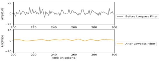 All the more, null values may happen because of different problems, such as application blunders, flawed sensors, uproarious conditions or development, and so forth. To our benefit, the collected data demonstrated no null values; subsequently, pre-processing for dealing with missing values was not required. Another type of uproarious data, called outliers, alludes to such data values in a dataset that causes an unusual conveyance in a data arrangement. They dwell at an irregular separation from the general dissemination. Consequently, any value showing a z-score more prominent than a determined upper threshold value or a value that is not a lower threshold value were considered outliers. After finding all of the outliers for every specified feature, we replaced the outliers with the mean of that feature. Applying Min-Max standardization to a dataset with the characteristics of various scales brought under an unconcerned scale may encourage the learning process to master utilizing that dataset. Since the dataset additionally incorporates diverse properties with various units, for example, meter per square second for the tri-axial accelerometer, radian per second for the tri-axial gyroscope, the percentage for relative humidity, and Fahrenheit for temperature, we practised Min-Max standardization to scale them between an aloof scope of 0 and 1. Sensor signals lose their smoothness due to the gravitational field, and thus fluctuation occurs. The Butterworth low pass filter can be defined as a type of signal processing filter that is designed to convert a generated frequency into a smooth one. Fourier transforms break down any signal and can be exhibited as a sinusoidal signal, and a Fourier transform was employed in this process. After the employment of the filtration process, we achieved a valuable outcome, which can be depicted by the following figure, Figure 2, for the X-axis of the accelerometer sensor.