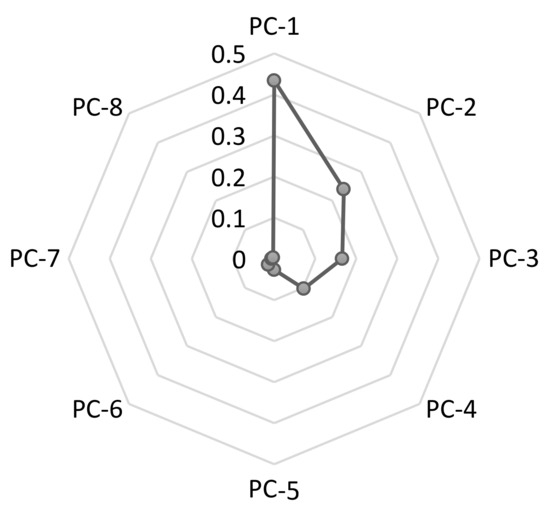 Low-dimensional subspace tradeoff lowers time complexity to speed up the classification process. We had to recognize activities from bulk smartphone sensor data. Consequently, we investigated the roughly equivalent value to select which vectors could be removed without losing an excess of data. The eigenvalues of the eight principal components (PCs) are depicted in Figure 3. In the wake of arranging the Eigen pairs, the following inquiry is “What number of essential segments are we going to decide upon for our new component subspace?” A helpful measure is the supposed “clarified fluctuation”, which can be determined from the eigenvalues [49]. The clarified change reveals how much data fluctuation can be accredited to every one of the chief segments. Though there were only eight features, the data size was too big. Therefore, we needed to make a reasonable tradeoff to speed up the classification approach. The PCs with a covariance that is greater than 0.1, an eigenvalue is greater than 1.0, and the covariance among the eigenvalues being greater than 0.1 have been selected for this study.