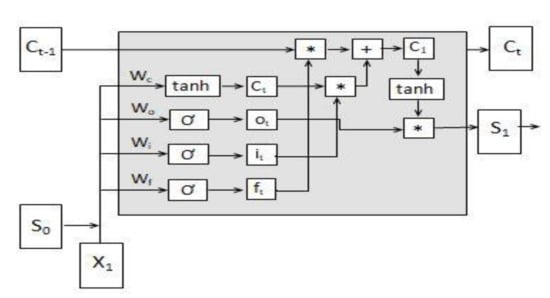 An LSTM cell is formed through an architectural point of view by a considerable memory cell block, as demonstrated in Figure 4. Hidden state and cell state are two states that stream data and make minor alterations by multiplying and adding it individually. The vital mechanics, known as gates, are used to recall sequences and controls in memory blocks. A gate called the forget gate is used to improve the execution of the LSTM network by removing less important data or data that are never required again for the LSTM using channel multiplication. To determine which data to dispose of and which order needs to be maintained, a logistic function contains the input in that particular phase (xt) and the hidden state of the previous cell (ht−1). After the forgetting state, the cell state concludes in this manner: