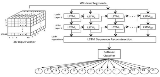 The construction of an integrated vector is depicted in Figure 5 by rearranging the dataset as a sliding window. A 3D vector is required to measure the group and time stages, and the stacked layer sizes of the window are also called input shapes. 1000 values are installed as a batch. The batch size refers to how many different examples the network feeds at once. The frequency within each example in the time vibrating pattern is described in time steps. The input data are then sent to several mounted LSTM layers folded throughout all of the time steps, with the layer size equal to the LSTM model’s hidden layer dimension. The 3D vector is also present in the cell’s output, as it was in the input shape. The LSTM output cell incorporates an additional final output that performs a Softmax activation function to arrange multiclass characteristics.