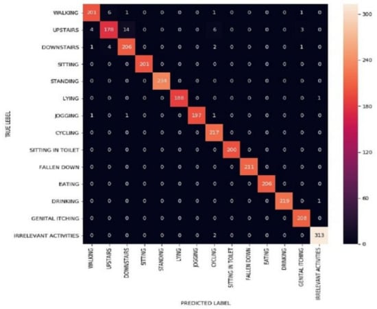 The smartphone might be removed from the user’s pocket; possible causes include placing the device on any chair, bed, or any other location or when the smartphone needs to be charged. Moreover, the user may use the device for browsing, typing, or talking. In typing, browsing, or talking via phone, the user may remain in the seated, standing, or lying positions. Therefore, we have included these activities in a separate category called irrelevant activities. Thus, we have included irrelevant activities to be recognized together with diabetic symptomatic activities. Another significant issue we needed to determine is whether an individual can place the smartphone in his/her pocket in any position, such as in the flipped position or if the smartphone is upside down or downside up. Because of this, we have amassed data by keeping the phone in four conceivable positions in the pocket. To ensure that the system is more robust, we collected data from indoors and from outdoor circumstances. For instance, the stipulated data subjects walked through a mall, on a free road, on a busy road, in a room, and so forth, and the data sensors collected walking data for all of these situations. We considered a mode for sitting in a squatting position and a normal sitting mode for using the toilet, with the sensors collecting data on the lower commode and the higher commode, respectively. We commenced the data collection process with the help of 10 volunteers who agreed to assist this study. Nominated volunteers were subjected to the data accumulation process and amassed data for 14 previously mentioned diabetic symptomatic activities. They were all young, healthy, and had no underlying health issues. The trial dataset had 7000 occurrences for each diabetic symptomatic activity, different from the irrelevant activities. There were 10,000 occurrences of irrelevant activities in the trial dataset. Altogether, the dataset holds 101,000 occurrences of 14 unique activities.