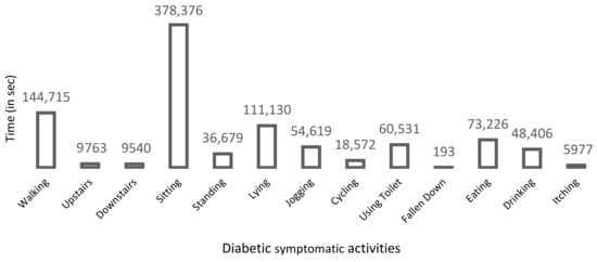 We sought to identify activities similar to the symptoms of Diabetes because of a widely disparate aspect of Diabetes. Daily exercise could even reduce the risk of developing the development of insulin resistance. Types of Diabetes, the intensity of exercise, and the complicating factors associated with Diabetes differ in the complexities associated with blood glucose control [44]. Walking, walking upstairs, walking downstairs, jogging, and cycling were classified as activities linked with cardiovascular movement in this regard [45]. In contrast, we recognized drinking, eating, and toilet activities to record the urination log [46]. Moreover, acquisition activities, such as falling, make it easier to identify physical weakness [47]. The aptitude to recognize activities such as lying down, sitting, itching the genitals, and standing strengthens the capability to detect complaints correlated with type 2 diabetes [48].