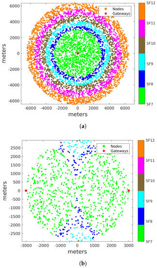 - Cuomo, F.; Gamez, J.C.C.; Maurizio, A.; Scipione, L.; Campo, M.; Caponi, A.; Bianchi, G.; Rossini, G.; Pisani, P. Towards traffic-oriented spreading factor allocations in LoRaWAN systems. In Proceedings of the 2018 17th Annual Mediterranean Ad Hoc Networking Workshop, Med-Hoc-Net 2018, Capri Island, Italy, 20–22 June 2018; pp. 1–8. [Google Scholar] [CrossRef]