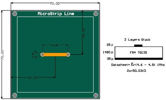 The NFP-PCB performance is analyzed by means of the scattering parameters or S parameters and also by a careful analysis of the near-field spatial distribution. Thereby, the NFP-PCB is characterized in terms of its response, bandwidth, and sensitivity. The measurement setup designed to evaluate the performance of the NFP-PCB uses a 50 Ω microstrip line (MSL) as a radiating source. The MSL is implemented in a FR-4 TG135 substrate PCB with dimensions of 70.0 mm length, 70.0 mm width, and 1.55 mm thickness, as shown in Figure 4. It consists of a two layers PCB, where, on the top side, the copper strip conductor with 20.0 mm length, 2.6 mm width, and 0.035 mm thickness is printed. On the bottom side, a ground plane of copper with 0.035 mm thickness is placed, and two SMA connectors are connected one at each end of the strip conductor. The SMA connectors are placed on the Bottom layer, and they were connected with both ends of the MSL through two vias.