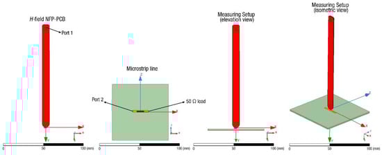The objective of this work is to present a new measurement probe, with a modeling that allows obtaining fast results under small changes. FEM modeling with Ansys allows making small changes very quickly to improve the probe design in prototypes. Other numerical techniques, such as FDTD, could be used, [49,50]; in fact, we could have modified some of our programs for that purpose [51,52]. The FEM results can be compared with experimental or from other techniques. The proposed simulation model is shown in Figure 6. The NFP was placed vertically on top of the MSL with zero distance between them in order to obtain the maximum receiving signal. One of the ends of the strip conductor is connected to a port that provides the frequency sweep signal to the MSL. The other end of the strip conductor is matched with 50 Ω load. A second port is connected to the end of the NFP-PCB in order to obtain the signal acquired by the probe. Thereby, it is possible to emulate the desired measurement setup and obtain the S21 parameter to be compared with the experimental results to verify the results. The S21 parameter, or transmission parameter, versus frequency will provide the bandwidth in which the antenna shows a flat response. The reflection coefficient (S11 parameter) can be obtained by doing a FEM simulation of the NFP-PCB by itself, without the MSL. In this case, only the lumped port connected to the output connector of the probe is considered. Furthermore, spatial H-field strength distribution in terms of parallel and vertical planes to the NFP-PCB, as well as its total gain is analyzed to obtain the sensitivity parameter.
