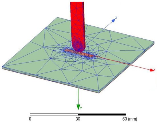 The FEM numerical mesh involves both the MSL described above and the NFP-PCB antenna. The mesh operation has been applying on the radiation boundary that is defined as an airbox separated from the sides of the 3D model a factor of λ/4, considering the maximum operation frequency [53]. This simulation software applies an automatic adaptive meshing procedure that accurately and efficiently calculates the fields in a model. The process starts with translating the modeled geometry into a conformal, inhomogeneous tetrahedral mesh. This mesh is coarse in areas where the geometry consists of large objects and dense in areas where the geometry has fine features. This initial mesh is refined to limit the maximum size of the mesh elements and comply with any user-specified mesh operations [54]. The maximum size of the mesh elements has been determined by λ/4, considering the maximum operation frequency [53]. The first adaptive pass is completed by solving this mesh at the single solution frequency to determine the fields and S parameters of the model. This automatic adaptive process continues until the mesh converges. The mesh is converged when the S parameters change between two consecutive adaptive passes by less than a user-specified convergence criterion. When the mesh adapting process is completed, Ansys HFSS will solve the mesh at numerous frequencies to determine the user requested frequency behavior of the model [54]. Figure 7 shows the mesh applied to our measuring setup model.