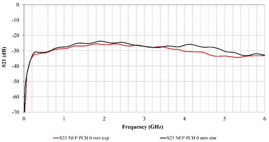 Figure 10 shows measured and simulated S21 parameter. From Figure 9, the gain of the NFP-PCB, as well as the bandwidth, is obtained. Figure 10 shows that the NFP-PCB has almost a flat response from 180 MHz to 6 GHz, with an almost perfect concordance between numerical and experimental S21 results. There is a small deviation of around 5 dB between 4 and 5 GHz. Moreover, there is a small frequency ripple whose peaks separate in frequency with increasing frequency, possibly due to a small capacitance associated with the assembly that varies little with frequency. It should be noted that the assembly has not been modeled with FEM, neither the VNA nor the surrounding desk. However, these small deviations are not considered critical in the typical NFP-PCB operation. The experimental transmission loss achieves a maximum value of −36.0 dB, whereas the minimum S21 is −23.6 dB. The numerical results show an average transmission loss of −27.9 dB by considering the flat response bandwidth, whereas the experimental one is −29.7. The obtained results for NFP-PCB are good enough to provide an adequate dynamic range for general measurement equipment intended to RF applications. If a higher gain and higher S21 would be needed, an external preamplifier module could be introduced between the NFP and the measurement equipment.