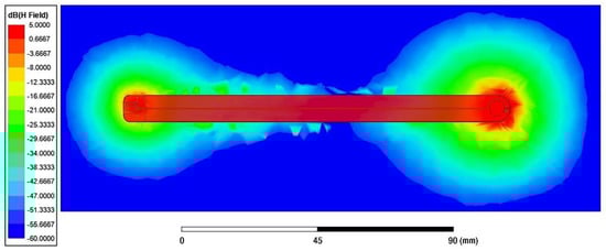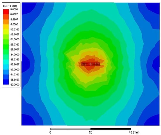 The magnetic field from NFP-PCB is numerically obtained from the FEM simulation, Figure 11 shows the magnitude of the H-field (500 MHz) in the x–y plane, the plane that encloses the NFP-PCB substrate. Figure 12 is the H-field (500 MHz) in the x–z plane, the plane orthogonal to the NFP-PCB substrate. The H-field magnitude distribution shows the sensitivity of the probe at different points depending on position, following the reciprocity theorem [58] the point with highest the radiated H-field is also the point of highest sensitivity. These are the points near the loop but also the opposite points of the NFP-PCB.