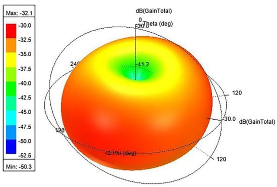 Figure 13 shows the far-field FEM simulation of the NFP-PCB, i.e., the radiation pattern. This approaches closely the radiation pattern of a magnetic dipole, although distorted by the spurious radiation of the feed line. The knowledge of the gain is not relevant for the NFP-PCB operation because it is used in the near field region; however, it is numerically calculated to check the validity of the FEM simulations.