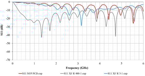 Figure 15 and Figure 16 show a comparison between the designed NFP-PCB and two commercial probes that are considered as reference values in order to evaluate if the presented probe is suitable for measuring H-field sources. From the S11 parameter results, it is possible to observe that the NFP-PCB has a similar response to the commercial probe with lower loop diameter (XF-R 3-1). This is in agreement with the expected results since the other commercial probe (XF-R 400-1) has a diameter loop ten times higher, approximately. The analysis of S21 parameter shows that the frequency value at which the NFP-PCB starts having a flat response (180 MHz) is significantly similar to the XF-R 400-1 probe. Additionally, both probes have a comparable initial attenuation factor (about −34 dB at 190 MHz). The XF-R 400-1 shows a flat response from 100 MHz to 6 GHz, having an average value of −25.8 dB and reaching a maximum and minimum value of attenuation of −35.5 dB and a −18.6 dB, respectively. As for the XF-R 3-1, its flat response starts at 800 MHz (with an error lower than ±5 dB), and the average value of the flat response is −33.3 dB. This probe provides a minimum value of −39.9 dB and a maximum of −29.8 dB. From this data, it is possible to conclude that the NFP-PCB has a comparable response to both the commercial probes, providing a similar bandwidth and average value than the probe with larger diameter (XF-R 400-1).