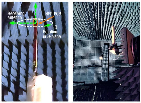 NFP-PCB vertically mounted to measure H-plane radiation pattern. Measuring setup in anechoic chamber.