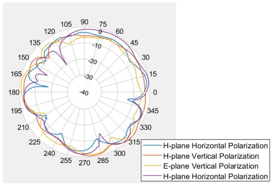 The radiation pattern of build NFP-PCB is measured to compare its performance as non-directive microwave receiver in the measurement of environmental radiation. The NFP-PCB was mounted in the positioner of the anechoic chamber (shown in Figure 17) and a broadband ridge waveguide antenna was used as probe. The maximum of transmission was measured at 828.5 MHz, which was the frequency used to measure the radiation patterns. Figure 17 shows the experimental setup to measure the H-plane radiation pattern. Figure 18 shows the NFP-PCB radiation patterns, for the horizontal polarized E-field and vertical polarized E-field in the H- and E-planes. The E-plane is the plane that contains the loop of the NFP-PCB, and H-plane is perpendicular to it. The NFP-PCB has two nulls in the H-plane horizontal polarization 180° between them, as it was expected because it is a loop antenna. However other aspects of a loop antenna are not kept. We measure high levels of vertical polarization in the E-plane and also nulls in the horizontal polarization E-plane. This is due to the feed line, and gap, with the multilayer structure of the PCB.