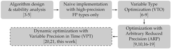 A typical FP algorithm implementation flow is shown in Figure 1. It is a process that usually starts with the algorithm design and mathematical stability analysis [3,4,5]. The next step is often a naive implementation, where all variables are declared in high precision formats, e.g., using double or long double type variables in C/C++. Next, the process of Variable Type Optimization (VTO) [6,7,8,9] is overtaken. Its objective is to migrate as many variables as possible from high precisions to lower ones for a given constraint. For example, by carefully changing double variables to float or long double variables to double, either manually or automatically, one can still satisfy a given Quality of Result (QoR) constraint on the output. Then, designers can use arbitrary Reduced Precision (ARP) [10] for fine-grained bit-width optimization. It consists of reducing the exponent and/or mantissa bit-widths to either narrower standard bit-widths such as the 16-bit binary16 format [11], or custom reduced arbitrary bit-widths such as Intel Nervana’s Flexpoint [12], Microsoft Brainwave’s 9-bit floats [13], Google TPU’s 16-bit BFloats [14], and NVIDIA’s 19-bit format [15].