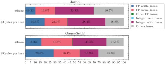 Although executed FP arithmetic and memory instructions are limited to 10.2% (resp. 16.2%) and 19.8% (resp. 31.5%), they constitute 19.5% (resp. 28.8%) and 23.0% (resp. 26.4%) in terms of how many cycles are actually spent on each instruction for Jacobi (resp. Gauss–Seidel).