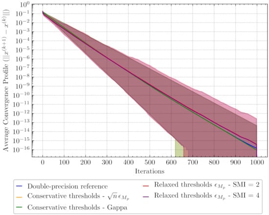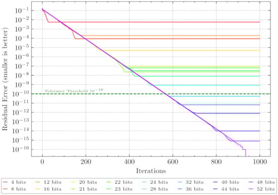 This example demonstrates that it is unnecessary to compute all iterations with double precision. For instance, for Jacobi to reach a target error threshold, the designer only needs an FP format with a 32-bit mantissa, i.e., the FP format (11, 32), which has a total bit-width of 44 bits. Similarly, for Gauss–Seidel, a 28-bit mantissa, i.e., a total bit-width of 40 bits, is sufficient to reach a target error threshold of .