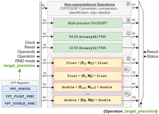 VPT-FPU contains two types of data-paths: precise data-paths, that contain standard-precision arithmetic operators, and approximate data-paths, that contain reduced arbitrary precision operators. The proposed architecture (Figure 4) includes: