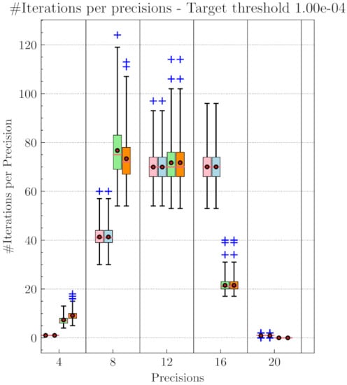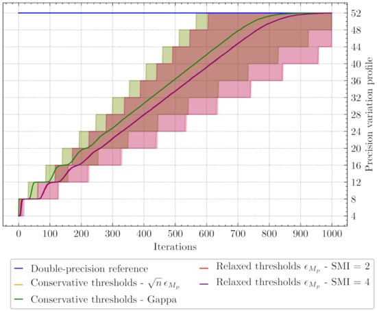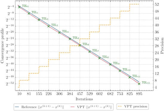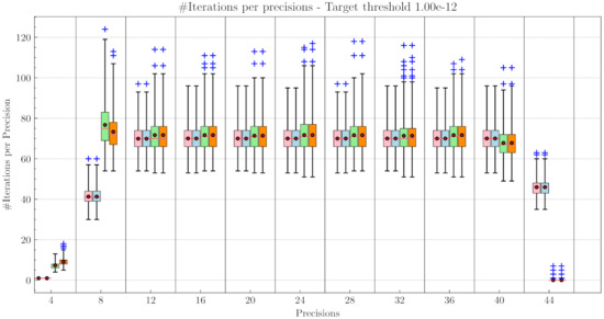 - Chatelain, Y.; Petit, E.; de Oliveira Castro, P.; Lartigue, G.; Defour, D. Automatic Exploration of Reduced Floating-Point Representations in Iterative Methods; Euro-Par 2019: Parallel Processing; Yahyapour, R., Ed.; Springer International Publishing: Cham, Switzerland, 2019; pp. 481–494. [Google Scholar]