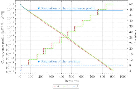 Convergence profiles (left axis, continuous lines) and their corresponding precision variation profiles (right axis, dotted lines) for three inputs (Matrix IDs 0, 1, and 2). The convergence profile here is in terms of the residual error metric ().