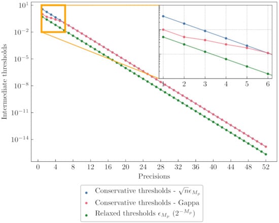 - Ho, N.; Manogaran, E.; Wong, W.; Anoosheh, A. Efficient floating point precision tuning for approximate computing. In Proceedings of the 2017 22nd Asia and South Pacific Design Automation Conference (ASP-DAC), Chiba, Japan, 16–19 January 2017; pp. 63–68. [Google Scholar] [CrossRef]