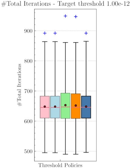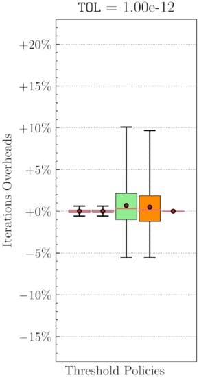 Please remember that, in this situation, the VPT relaxed threshold policy (2) has a more substantial impact on the number of iterations, as shown in Figure 13 and Figure 14. For example, input BR-12 sees a decrease in the number of iterations from 612 to 578 ( variation), translating to a 68.97% energy gain. On the other hand, WR-12 sees an increase from 700 to 763 iterations ( increase) which translates to 63.20% total energy gain, which is still an important achievement despite the extra iterations’ overhead.