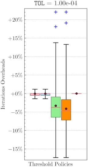 To conclude, the threshold policy (1) is a conservative approach that brings some predictability and safety along with all the run-time variable precision benefits. On the other hand, threshold policy (2) is a relaxed approach that further optimizes power and energy consumption. However, it tends to alter the total number of iterations, sometimes favorably and sometimes negatively. However, even when the total number of iterations is increased, there is still a very interesting energy gain. Thus, threshold policy (1) is the safest solution, and threshold policy (2) represents a risky but optimized solution.