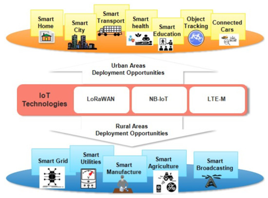 There are potential business-to-consumer (B2C) and business-to-business (B2B) opportunities of using LPWAN IoT technologies in developing countries, as shown in Figure 1. For example, the digital transformation of the farming sector in developing countries will ensure food security for the increasing population, and may increase the gross domestic product (GDP) and return on investment (ROI) [26,27] as well as support aspects of investment decision making through intelligent computing and big data analytics [28]. Other opportunities include improved security monitoring, increased productivity, quality control, transportation and supply chain optimisation. A well-established GSM and LTE cellular infrastructure could enable IoT to be more widely deployed in developing countries. In LTE and 5G, a 3GPP-standardised machine-to-machine (M2M) IoT solution can be relied on to deliver more bandwidth and device connection density per cell at lower latency. LoRa is also standardised, although perhaps to a lesser extent, towards co-existing with 4G and 5G ecosystems for IoT applications [29]. The requirements of massive, broadband and critical IoT applications can be met by different aspects of LPWAN technologies. Generally, massive IoT applications are delay-tolerant infrequent IoT devices of small data volumes used in challenging network connectivity and energy supply environments. Examples include smart metering and asset management where network roaming, extended coverage, and long battery life capabilities are required to reach all assets seamlessly. EC-GSM-IoT, NB-IoT, and LTE-M are the 3GPP-standardised protocols that meet the requirements of low-complexity IoT devices through GSM and LTE enhancements. This is the IoT application segment where the unlicensed LPWANs are also applicable.
