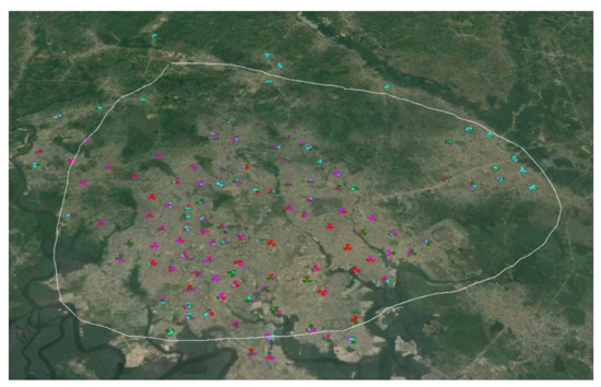 Typical LTE network distribution in urban areas in Nigeria. NB-IoT deployment leverages LTE infrastructure, which is mainly clustered within urban areas. The dots represent different sectors of two co-located 1800 MHz and 900 MHz sites. Red—the current number of users exceeds the expected number of users per cell; purple—the maximum number of users is reached; green—the number of users is within the range; blue—the number of users on the cell is low.