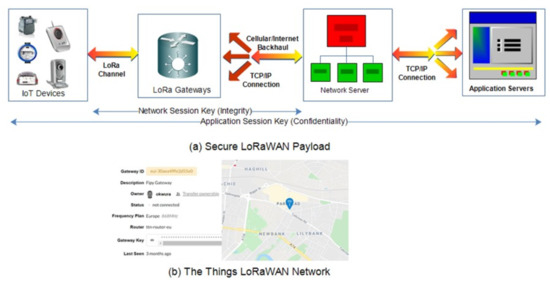 Secure LoRaWAN Architecture: (a) typical LoRaWAN architecture; and (b) LoRaWAN implemented on The Things Network.