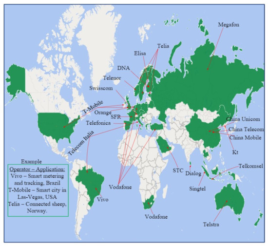Global NB-IoT deployment. Reproduced with permission from Collins Burton Mwakwata, Narrowband Internet of Things (NB-IoT): From Physical (PHY) and Media Access Control (MAC) Layers Perspectives, Sensors; published by MDPI, 8 June 2019 [21].