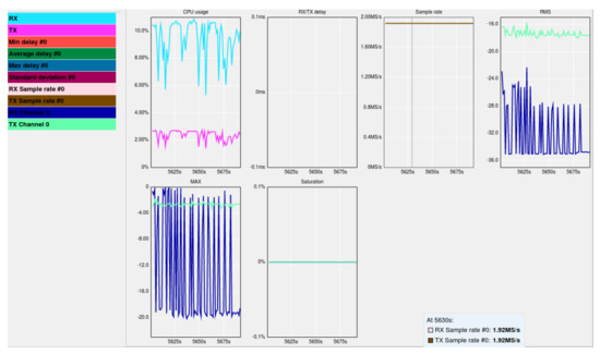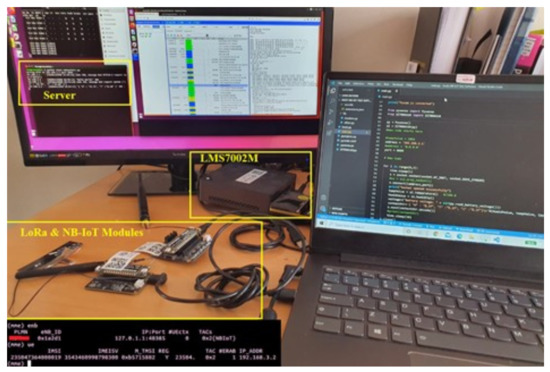 In our recent publication, we demonstrated the design and implementation procedure of the NB-IoT testbed [8]. The NB-IoT testbed specification includes a LimeSDR (LMS7002M) that generates the standard LTE core MME and eNB physical signals from the same CPU that runs Ubuntu Intel Core i7-8550U at 4 GHz, Ubuntu 16.04 xenial OS, 32G RAM, and x86_64-bit kernel. A multiple-input–multiple-output (MIMO) transceiver was based on field-programmable radio frequency (FPRF) for integrated circuit digital signal processing (DSP). The eNB has a 30.72 MHz reference clock, 780.500 MHz DL frequency, 725.500 MHz UL frequency on band 28 (DL EARFCN = 9435), filter order of 4, filter bandwidth of 5MHz, a real pole first order filter of 2.5 MHz, and a transmit and receive sample rate of 1.92 MSps. The NB-IoT node device is the Fipy and Pysense expansion board programmable in the Visual Studio Code and Atom and supports NB-IoT, LTE-M, SigFox, LoRa, Wifi, and Bluetooth IoT wireless technologies. Figure 7 shows our testbed in operation with illustrations on the functionalities and Table 4 shows the parameters’ configurations. With this, sensors could then be strategically positioned in various regions to monitor water quality and air pollution levels and the data collected transmitted to IoT cloud platform for analysis.