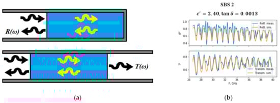 (a) The scheme of measurement of the reflection and transmission coefficients with the test sample in the form of the waveguide insert 7.2 mm × 3.4 mm × 100 mm (a); (b) comparison of the measurement results and simulation data for SBS plastic in the frequency range 26–40 GHz.