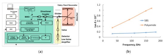 (a) The scheme of measurement of dielectric properties with the test sample in the form of the disk in the quasioptical resonator; (b) loss tangent of the SBS and polyamide.