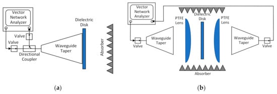 Schematics of the setups used to measure the dielectric disks parameters: (a) reflection measurements; (b) transmission measurements.