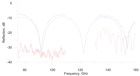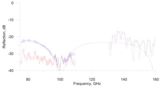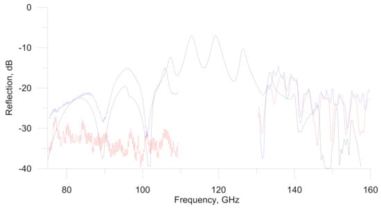 Reflection measurement results are shown in Figure 5, Figure 6 and Figure 7 for the flat-surface disk, disk with pyramids, and disk with one-dimensional corrugation, correspondingly. The disk with a one-dimensional corrugation of the surface was measured for both orthogonal linear polarizations. However, the results for the second polarization are significantly worse than for the optimal polarization. The measured reflection coefficient is below −18 dB for both corrugated disks in the frequency ranges of 75–110 GHz and 130–160 GHz. In contrast, the flat disk has a much narrower band with low reflections (10 GHz at the level of −20 dB). Note that the option with pyramids is more advantageous if radiation of arbitrary polarization is required, while the option with one-dimensional corrugation is better for specific linear polarization. The one-dimensional corrugation works better for lower frequencies but (due to its larger period) is worse for higher frequencies. Due to the high sensitivity of this shape to manufacturing tolerances, the measured reflection of one-dimensional corrugation significantly deviates from the calculated one, which is also noted in [19].