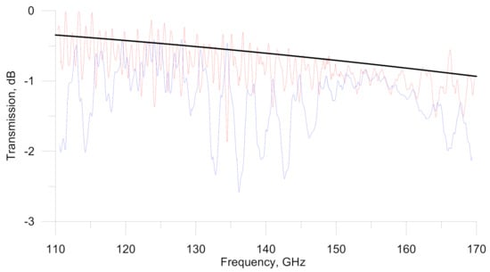 To measure wideband transmission, we used a quasioptical setup consisting of a vector network analyzer (VNA), a pair of tapers with PTFE lenses on adaptors, and an air gap between them (Figure 4b). Disks were placed in the center of the air gap, which is also the position of the Gaussian beam waist. The transmission through the two thinner disks is presented in Figure 8. The flat disk has a thickness of 3.15 mm, and the average thickness of the disk with pyramids is 3.33 mm. The low-reflection disk has a significantly better transmission and is very close to the maximum transmission predicted using the measured loss tangent of the polyamide. The disk with one-dimensional corrugation is not shown because it has high dielectric losses in this frequency band due to its bigger average thickness of 7.5 mm. The oscillations of the flat-sided disk transmission are caused by Fabry–Perot resonances inside the disk (period approximately 30 GHz) and resonances between the disk and one of the lenses (approximately 4 GHz). The reflection from the tapers causes fast oscillations (approximately 1 GHz).