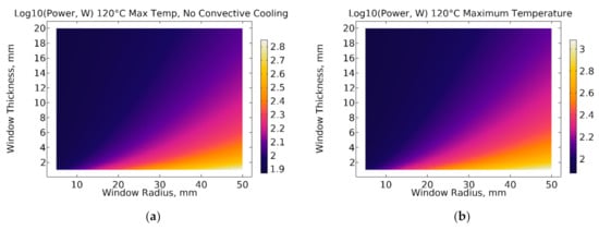 Simulation results for maximum 100 GHz CW transmitted power through the polymer windows without overheating. (a) the decimal logarithm of the maximum power value in watts without convective cooling (vacuum at both sides); (b) decimal logarithm of the maximum power value in watts with convective air cooling on one side.