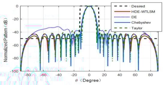 After the optimization process, the normalized radiation pattern of low SLL synthesis is shown in Figure 2. In order to verify the performance of the algorithm, the results of two traditional numerical algorithms: Chebyshev and Taylor algorithm are also given in this figure. The comparison results of main lobe width and maximum SLL are given in Table 1. The corresponding convergence curves of DE and HDE-WTLSM are plotted in Figure 3. Figure 2 and Table 1 show that the SLL obtained by HDE-WTLSM algorithm is much lower than that of DE algorithm and it also has advantages over traditional numerical algorithm. Figure 3 shows that HDE-WTLSM has a faster convergence speed than DE.