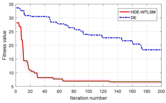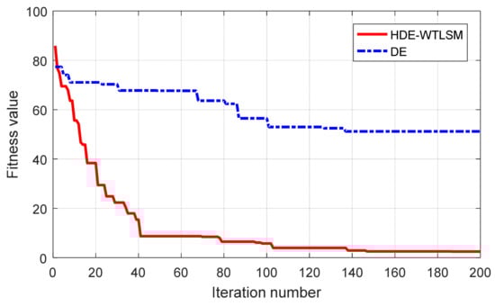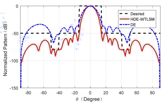 The second example is the null steering synthesis. In this example, the population number NP = 150, F = 0.6, CR = 0.8, , DSLL = −50 dB and NULL = −80 dB. The main beam-width is limited to −15°~15°. The null width is 10°. The normalized array patterns of null steering synthesis are shown in Figure 4. The convergence curves of null steering synthesis are plotted in Figure 5. In this example, HDE-WTLSM also shows a better performance than DE. The results of example 1 and example 2 are obtained from Matlab.